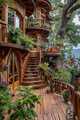 When designing your own façade in a similar style, attention should be paid to the use of untreated wood, preservation of natural curves and texture of the material, as well as the inclusion of "forest" design elements in railings and supporting structures. It is also important to consider color accents (like the green doors in this example), which can refresh the overall appearance of a wooden façade without disrupting its natural aesthetics.