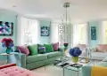 The interior of this country house living room embodies a perfect balance between elegance and casualness. The space is defined by an impressive high ceiling with interesting slope geometry, crowned by an elegant chandelier with crystal elements. The architectural feature of the room is the abundance of non-standard windows that maximize natural light and create a close connection with the surrounding landscape.